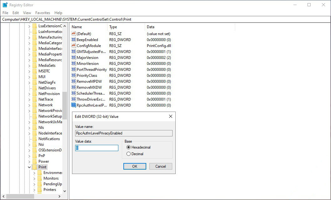 Nhập tên là RpcAuthnLevelPrivacyEnabled và đặt giá trị của nó là 0 như hình rồi nhấn OK.