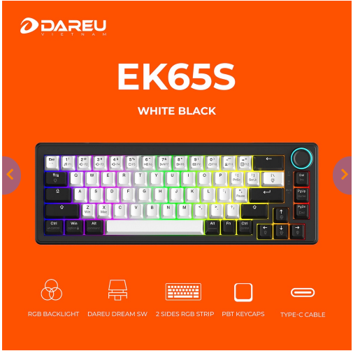 Bàn phím cơ DareU EK65s White Black Dream Switch là mẫu bàn phím gaming layout 65% nhỏ gọn, thiết kế hiện đại với keycap PBT bền bỉ và hệ thống LED RGB nổi bật. Sản phẩm sử dụng switch DareU Dream cho cảm giác gõ mượt, phản hồi nhanh, phù hợp cho cả chơi game và làm việc.