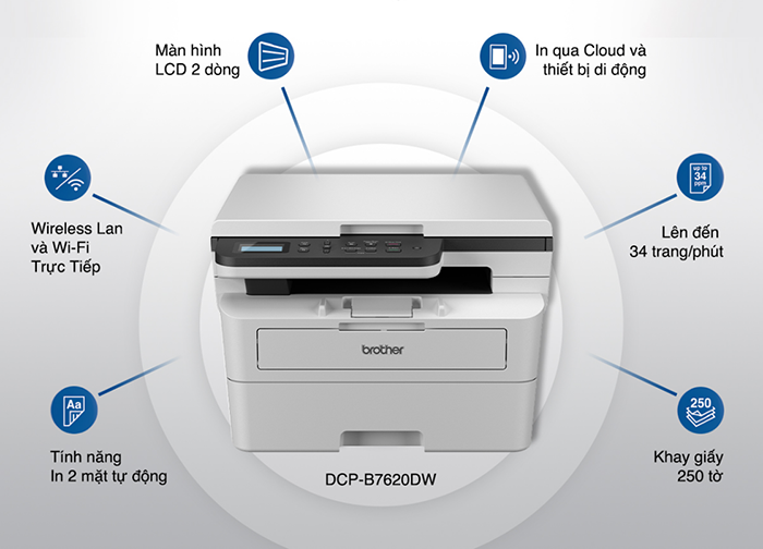Thiết bị hỗ trợ nhiều chuẩn kết nối như USB, LAN và WiFi, cho phép chia sẻ máy in trong mạng nội bộ hoặc in trực tiếp từ điện thoại, laptop một cách tiện lợi. Với tốc độ in nhanh và hệ thống mực Toner Box tiết kiệm, Brother DCP-B7620DW là lựa chọn phổ biến cho môi trường làm việc cần hiệu suất ổn định.